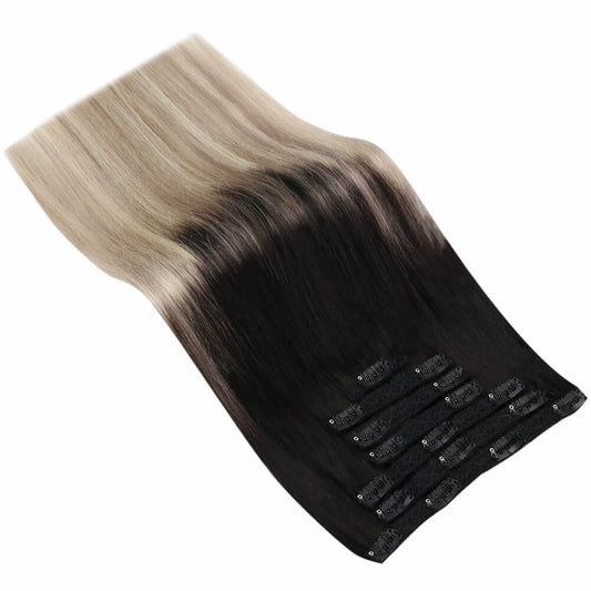100% Remy Human Hair Clip in Extensions Balayage Color #1B/18/60 Black with Blonde