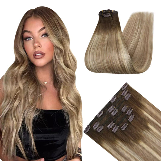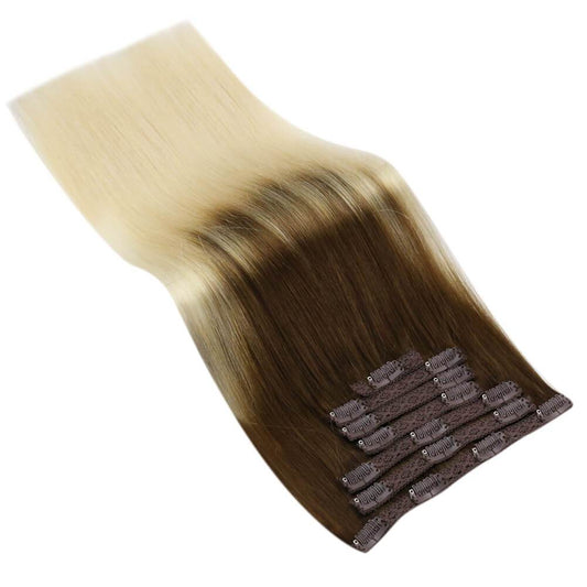 Full Head Balayage Ombre Clip in Human Extensions Brown Mix Blonde #9a/60