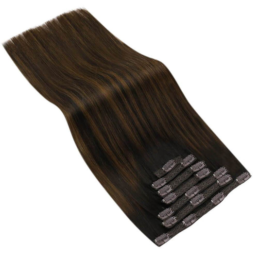 Clip in Remy Hair Extensions Real Hair Black to Brown with Blonde Hair 1B/3/12