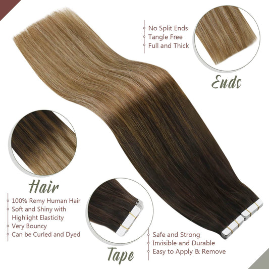 Remy Tape in Hair Extensions Brown with Blonde Ombre Color #2/6/12