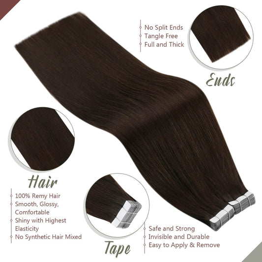 Tape in Human Hair Extensions Pure Color Darkest Brown #2 | Ugeat