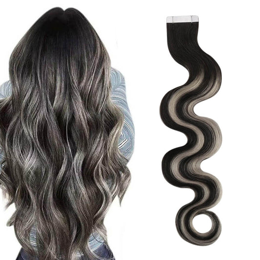 [Pre-sale] Injected Tape in Extensions Curly Virgin Hair Black With Silver 10Pcs #1B/Silver/1B