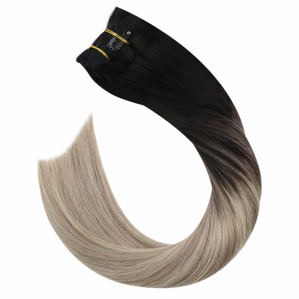 100% Remy Human Hair Clip in Extensions Balayage Color #1B/18/60 Black with Blonde